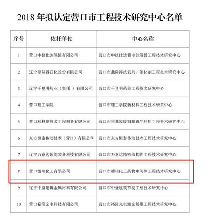 2018年11月9日,營口市科學技術局公布了關于擬認定2018年營口市工程技術研究中心的公示,依托營口德瑞化工有限公司申報的“營口市德瑞化工藥物中間體工程技術研究中心”被列入2018年度市級組建計劃中。
